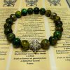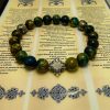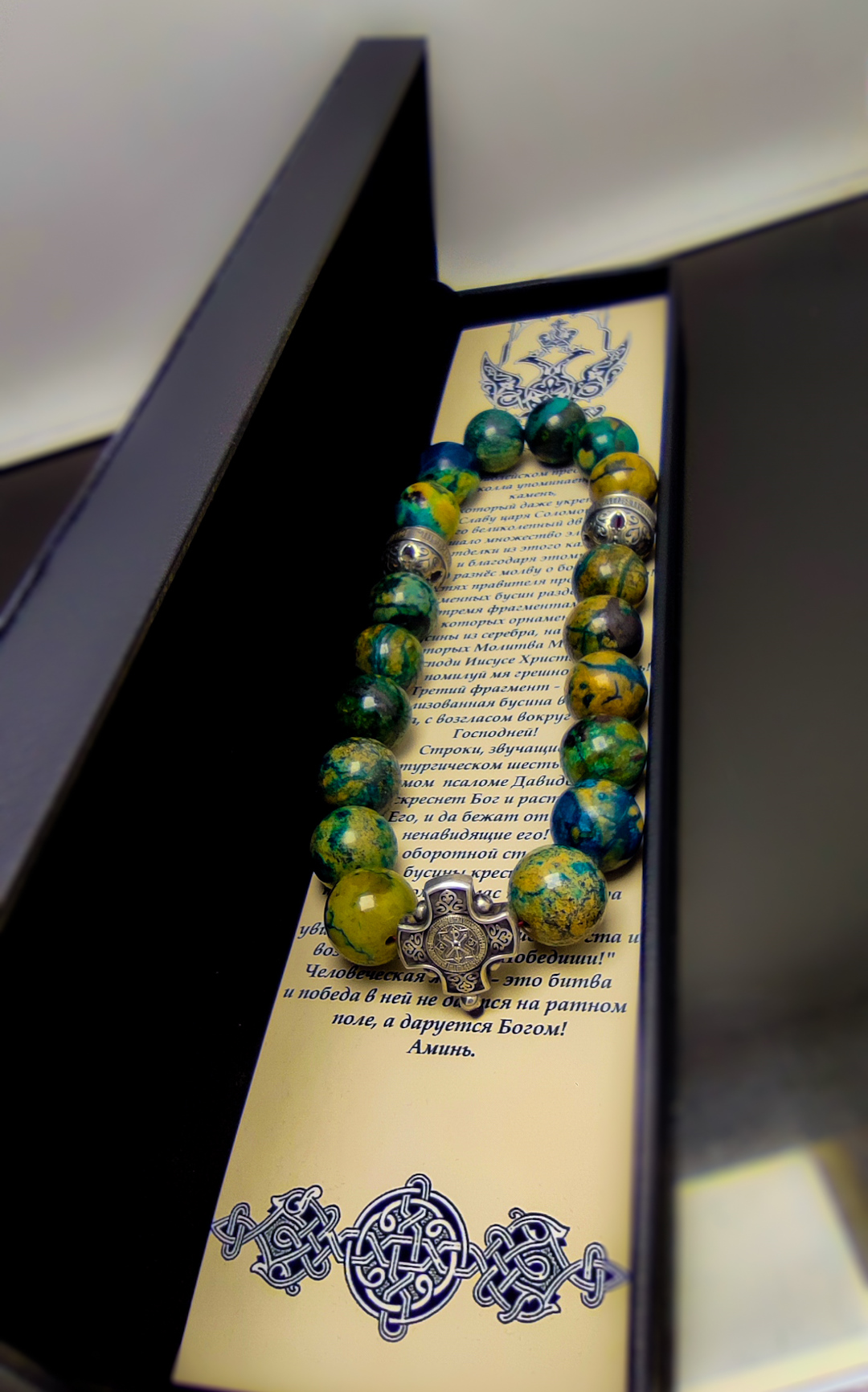 18 каменных бусин разделяются тремя фрагментами, два из которых, орнаментальные бусины из серебра, на ободке которых Молитва Мытаря.