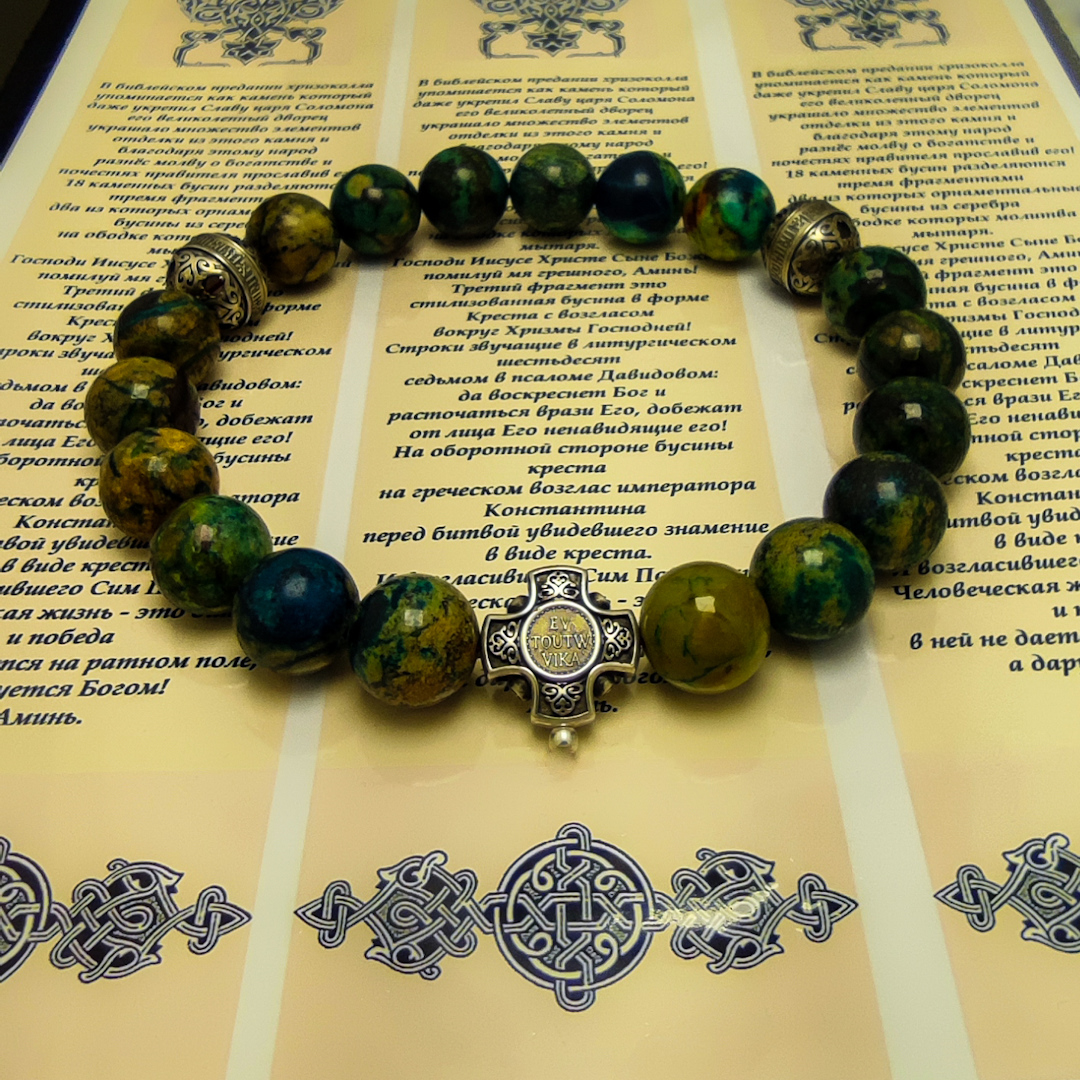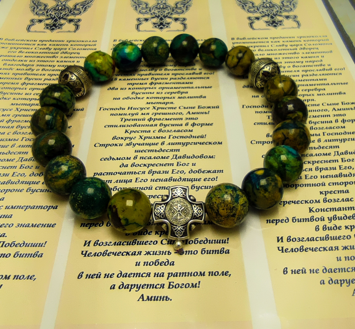 В библейском предании, хризоколла упоминается как камень, который, даже укрепил Славу царя Соломона. Его великолепный дворец, украшало множество элементов отделки из этого камня и благодаря этому, народ разнёс молву о богатстве и почестях правителя, прославив его!